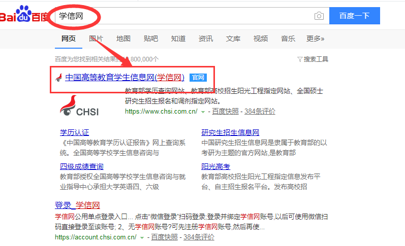 1、首先百度一下学信网,然后点按搜索结果中的官网链接。
